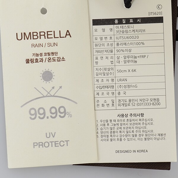 | 6. 취급시 주의사항 | 무리하게 펼칠시 고장의 원인이 되므로 제품을 가볍게 좌우로 흔들어 접힌 원단을 풀어준 후 펼쳐주세요 사용후 통풍이 잘되는그늘에 말려 보관하세요 우.양산의 중봉이 휘지 않도록 강한 바람이나 충격에 주의하세요 |
