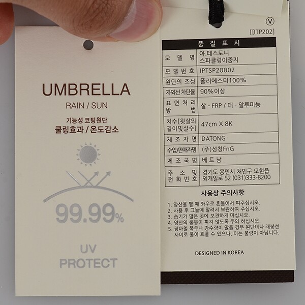| 6. 취급시 주의사항 | 무리하게 펼칠시 고장의 원인이 되므로 제품을 가볍게 좌우로 흔들어 접힌 원단을 풀어준 후 펼쳐주세요 사용후 통풍이 잘되는그늘에 말려 보관하세요 우.양산의 중봉이 휘지 않도록 강한 바람이나 충격에 주의하세요 |
