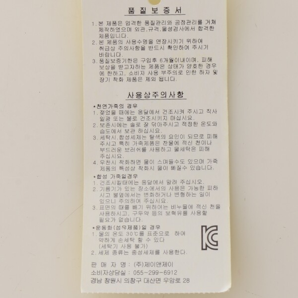 6. 취급시 주의사항 | 1.젖었을 때에는 통풍이 잘되는 응달에서 건조시켜 주십시요 2.오염시에는 비눗물에 적신 천이나 부드러운 브러쉬를 사용하십시요 |