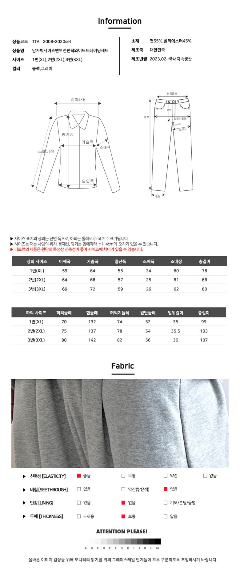남자 빅사이즈 무지 맨투맨 와이드 바지 세트