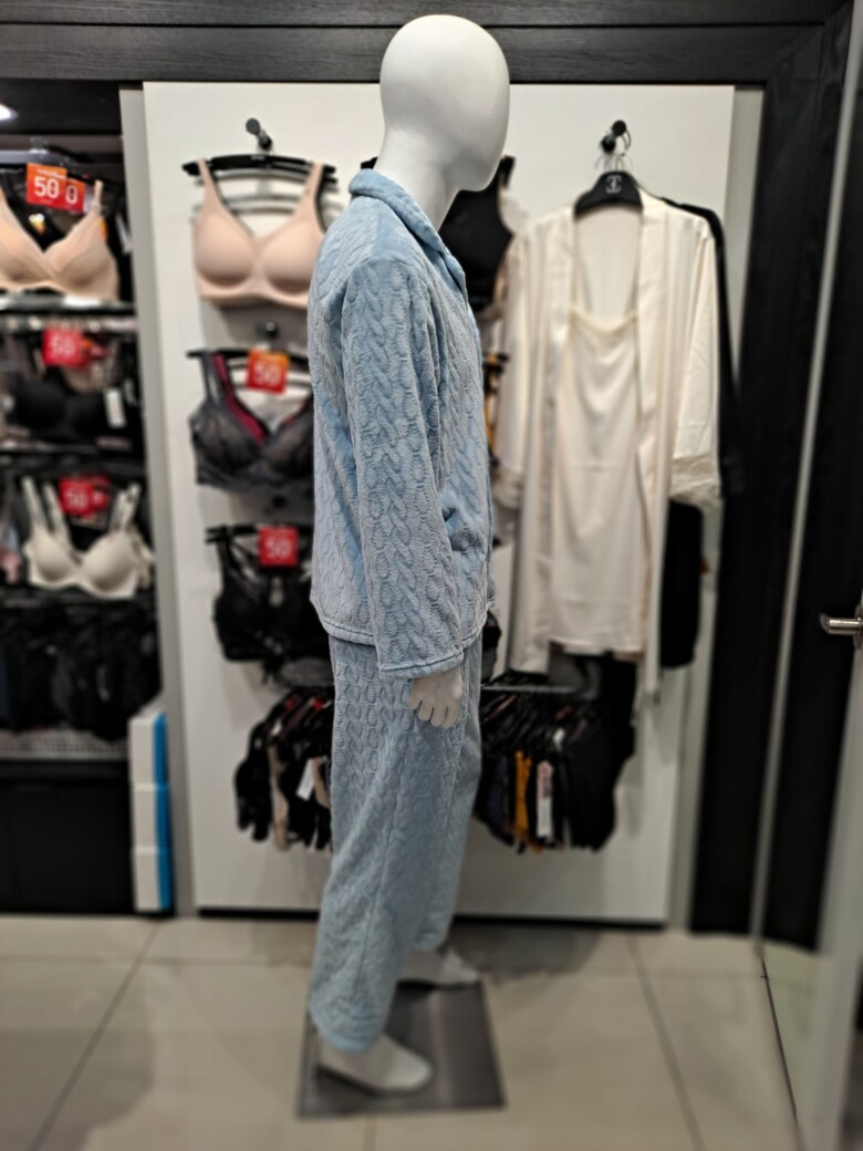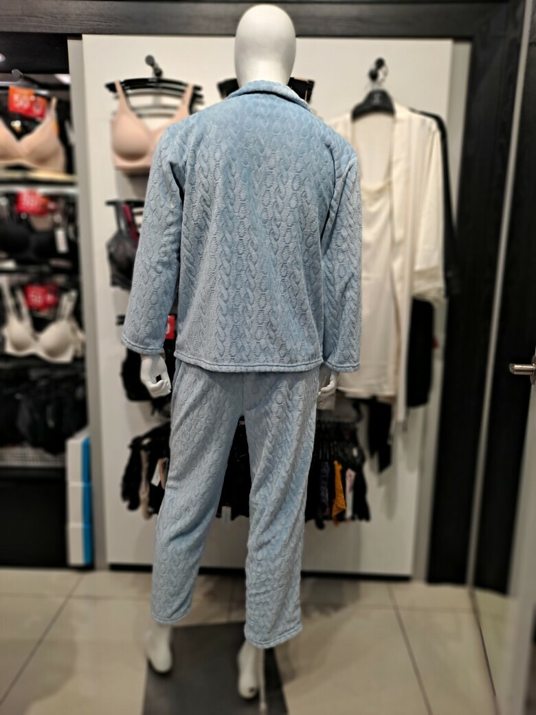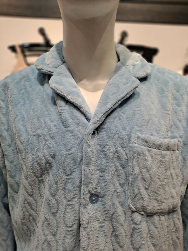블루루 컬러의 카라 스타일로 꽈배기 문양이 독특하고 귀여운 밍크터치 수면 파자마