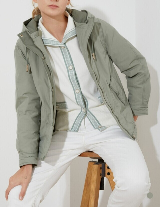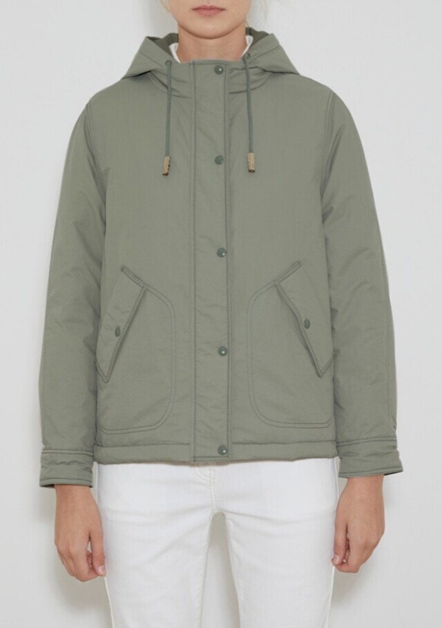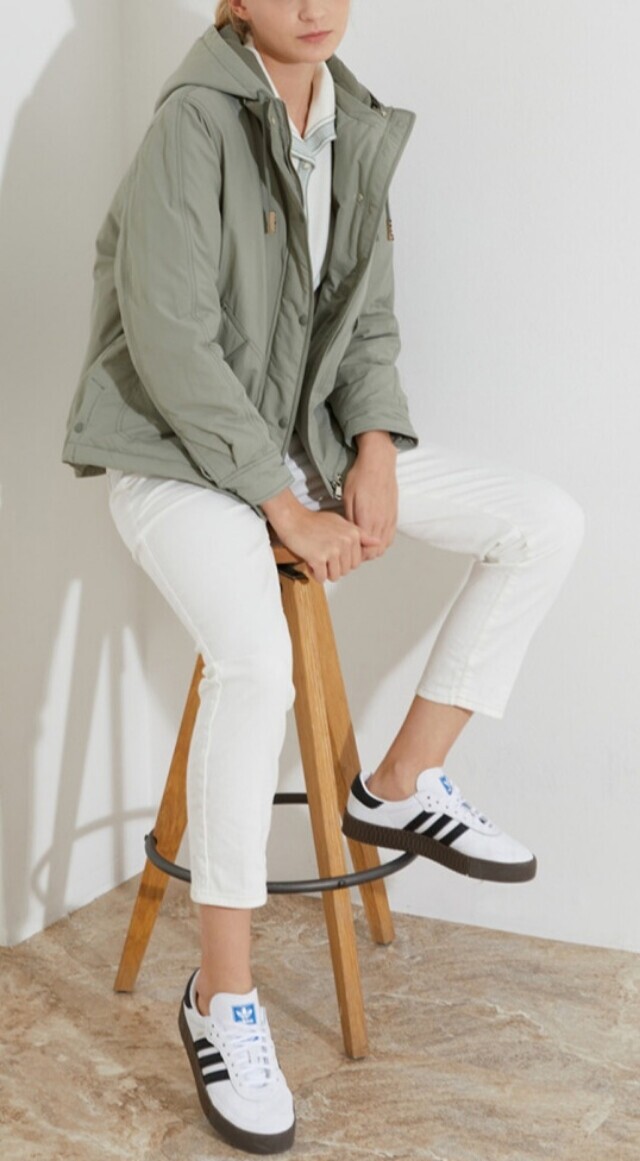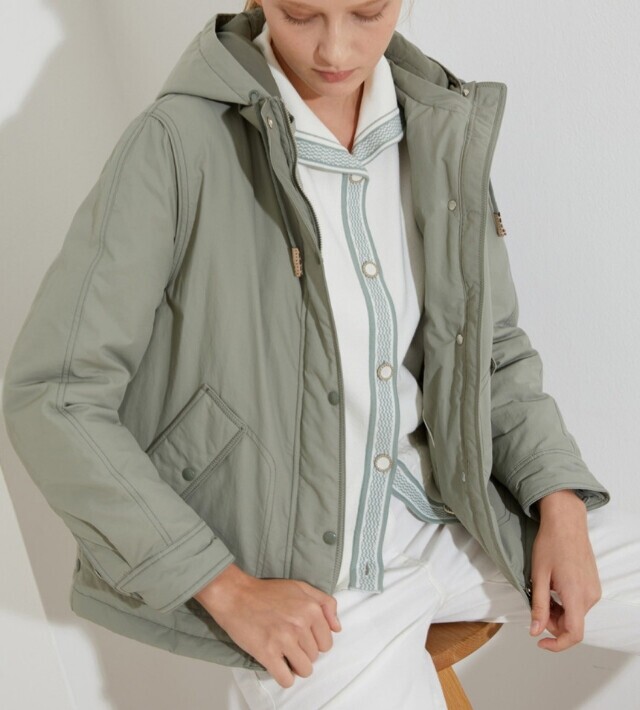 후드를 블록하여 캐주얼한 무드를 더했으며 밑단라인