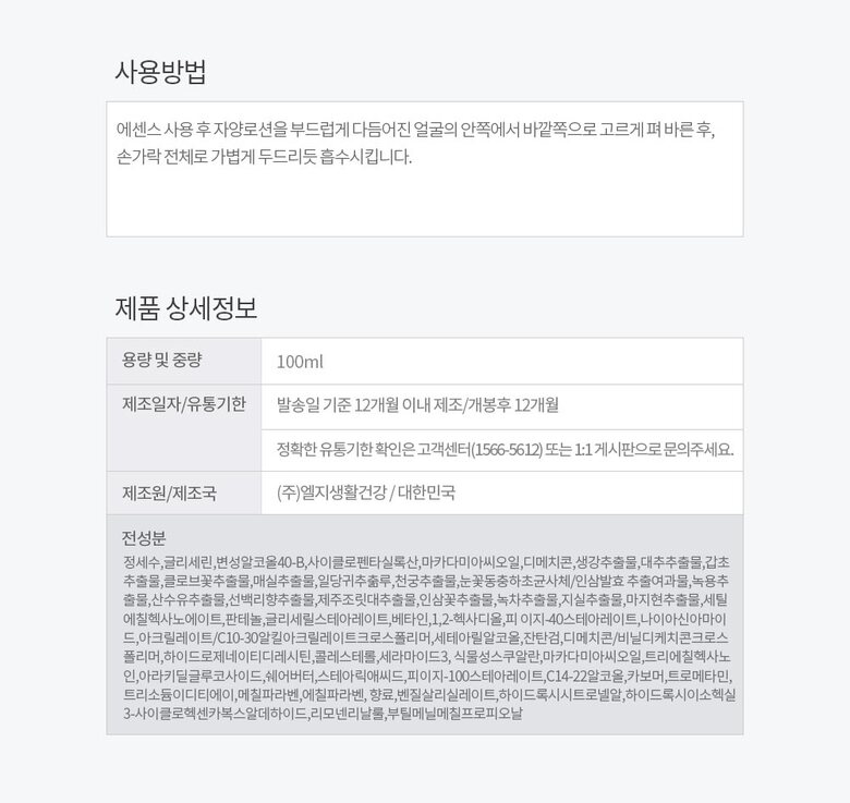 | 4. 사용방법 | 보양 에센스 사용 후 자양로션을 부드럽게 다듬어진 얼굴의 안쪽에서 바깥쪽으로 고르게 펴 바른 후, 손가락 전체로 가볍게 두드리듯 흡수시킵니다. |