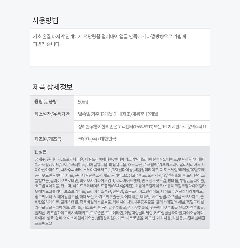 | 4. 사용방법 | 기초 손질 마지막 단계에서 적당량을 덜어내어 얼굴 안쪽에서 바깥방향으로 가볍게