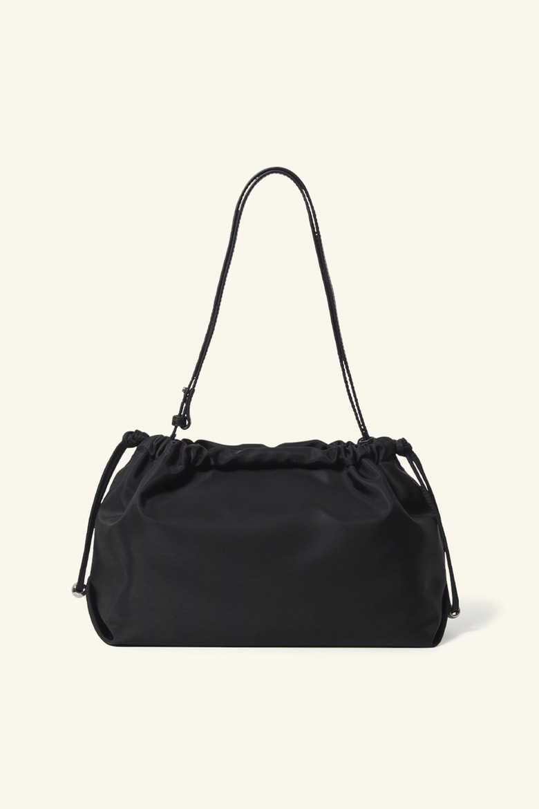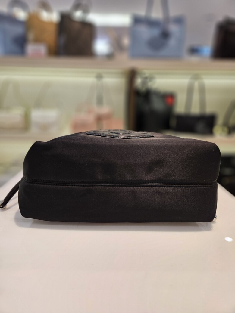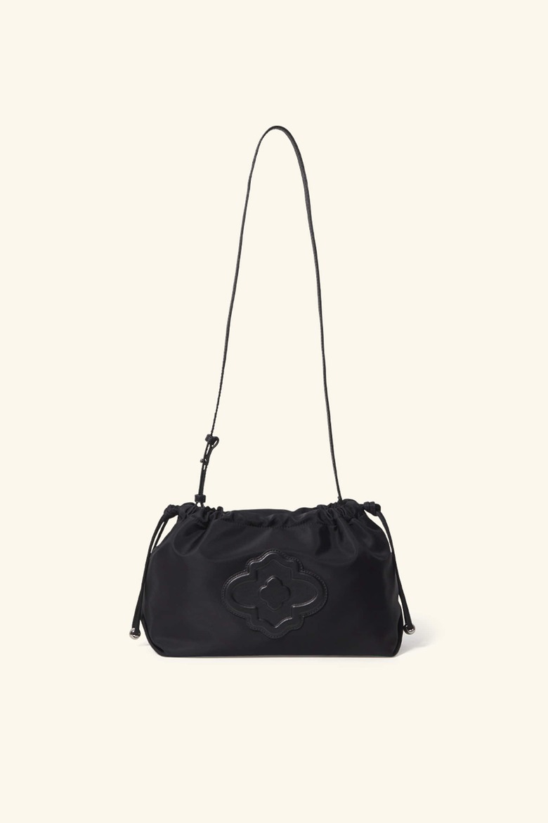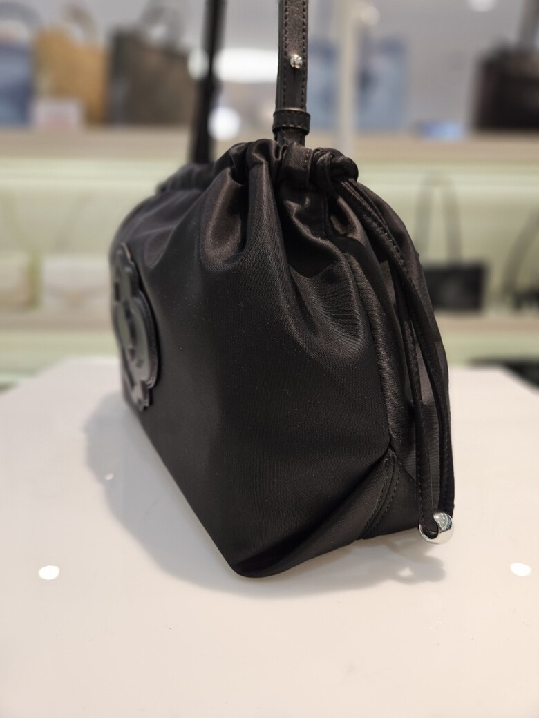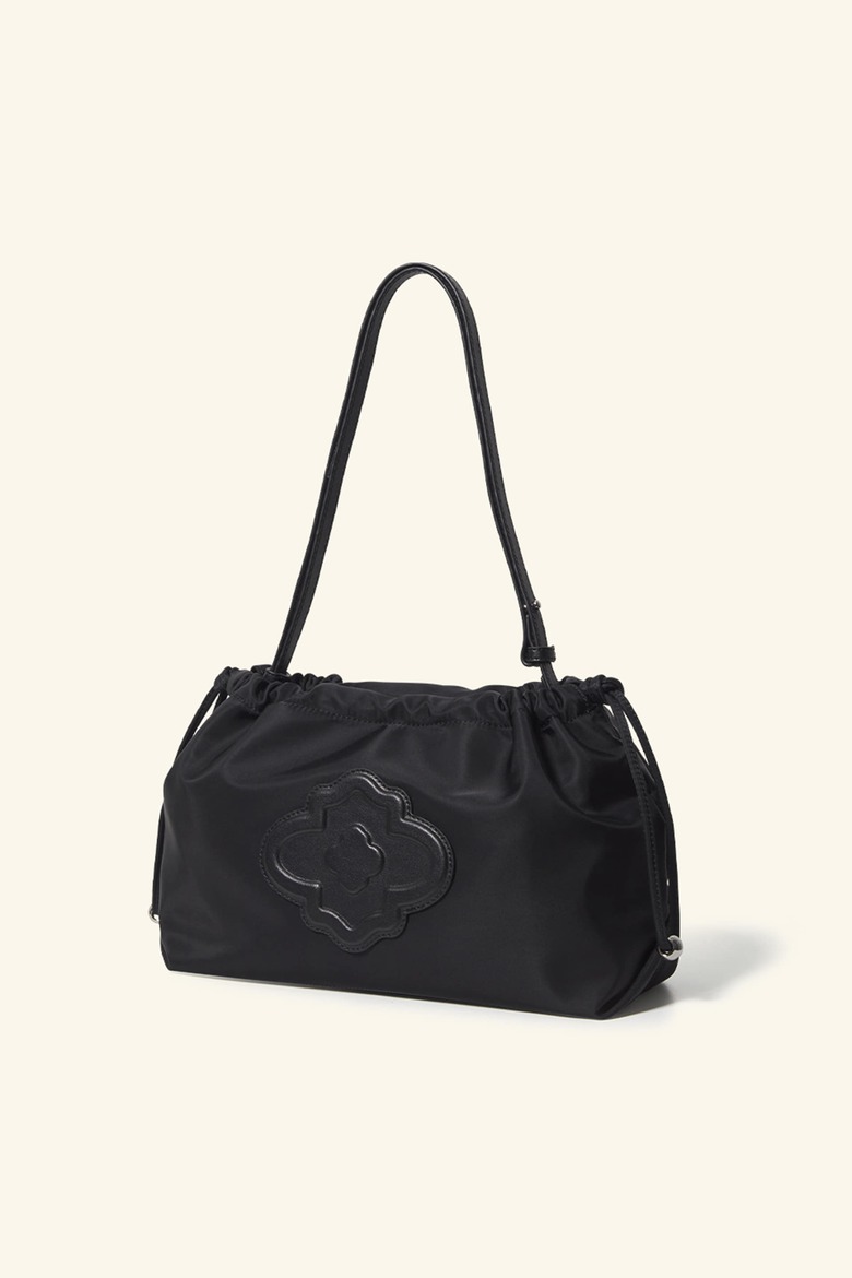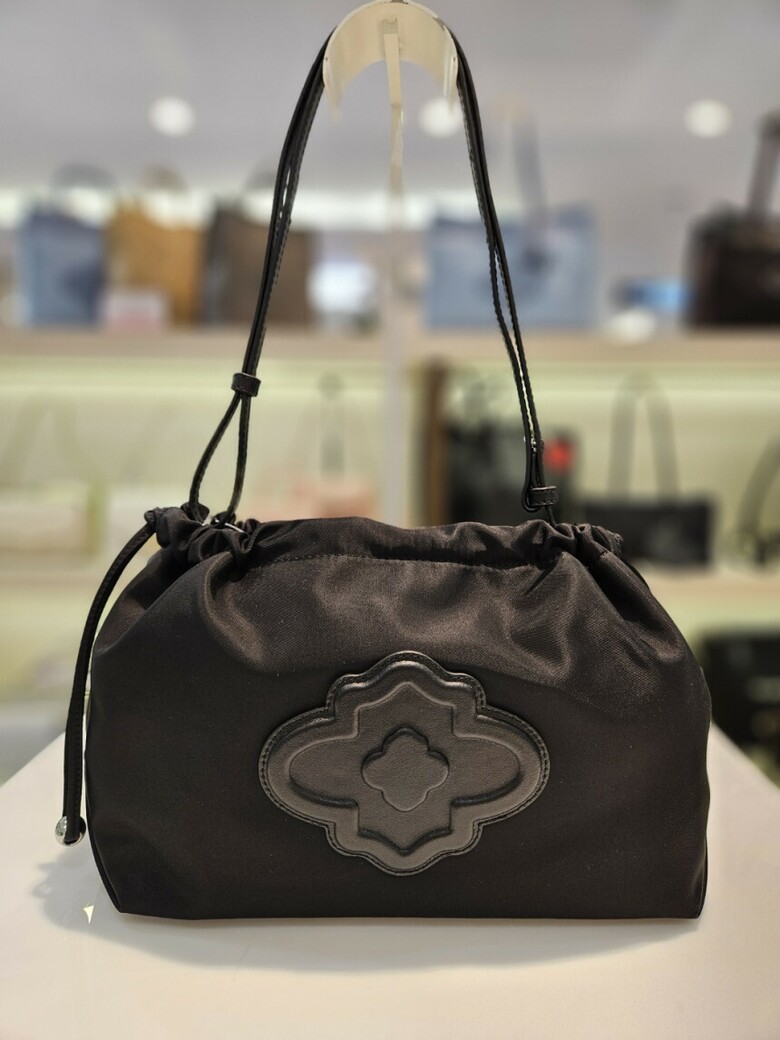 입체적인 모로칸 가죽 패치가 포인트인 미디움 사이즈 나일론 숄더백입니다