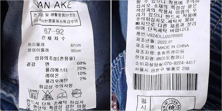 | 1. 제품 소재 (섬유의 조성 또는 혼용률을 백분율로 표시, 기능성인 경우 성적서 또는 허가서) | 겉감:면68% 폴리에스터20% 폴리우레탄2% 레이온10% |