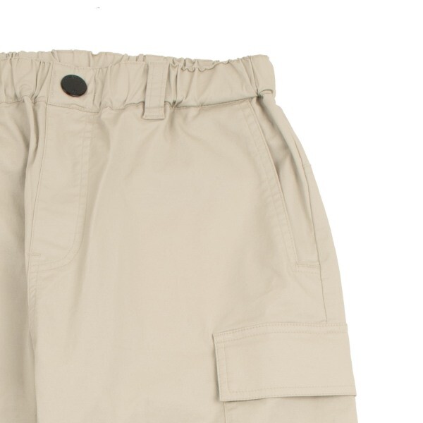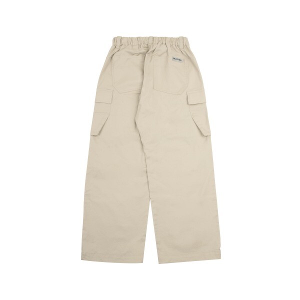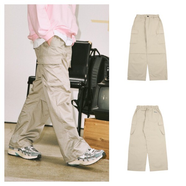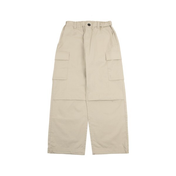 뉴트럴한 베이지 컬러의 통고무줄 우븐 팬츠입니다. 와이드한 스타일로 힙한 간지를 연출할 수 있고 밑단 스트링을 조여서 조거로도 스타일링 할 수 있습니다.옆선을 넘어가는 비정형적인 큼직한 아웃포켓이 포인트인 아이템입니다.무릎에 여유가 있어 아이들이 활동하기에도 좋습니다.