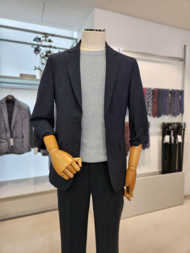 셔츠와 타이 코디도 가능하며 스웨터 와도 편안히 코디가 가능한 기본 셋업 입니다.
