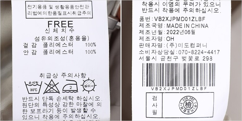 | 1. 제품 소재 (섬유의 조성 또는 혼용률을 백분율로 표시, 기능성인 경우 성적서 또는 허가서) | 겉감:폴리에스터100% 안감:폴리에스터100% |