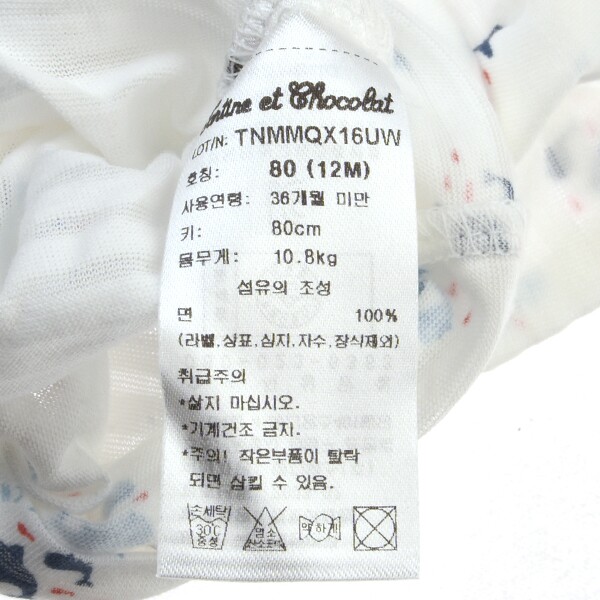 세탁방법 및 취급시 주의사항 : 단독세탁, 삶지 마십시오, 기계건조금지, 주의! 작은 부품이 탈락되면 삼킬 수 있음