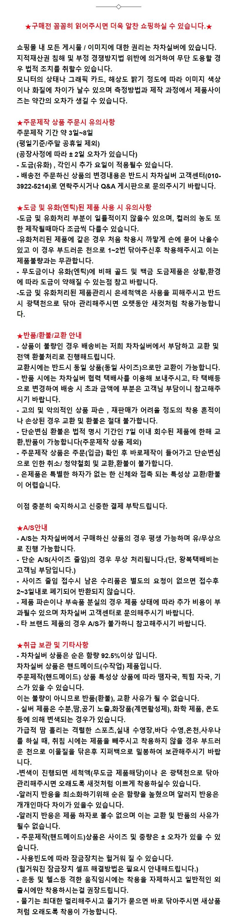 | 6. 착용 시 주의사항 | -미 착용시 부드러운 천으로 닦은 후 비닐팩 보관 / 사우나, 온천, 바닷물 착용금지 (무도금 외에 제품은 세척액 사용금지)