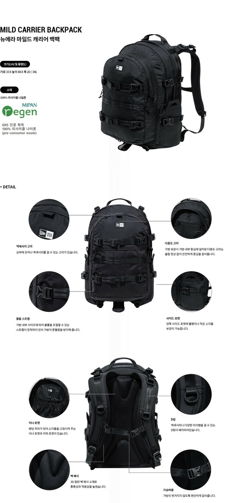 튼튼한 내구성과 실용성으로 꾸준히 사랑받아온 뉴에라 캐리어 백팩이 새로운 버전으로 돌아왔습니다. 스포티한 디자인에 다양한 포켓, 고리, 버클로 뛰어난 실용성을 자랑합니다. 3단 수납으로 넉넉한 수납 공간을 가지고 있으며, 측면 사이드 포켓에는 스포츠 보틀 혹은 작은 소지품을 보관하기에 용이합니다. 가방 본체와 스트랩에 부착된 다양한 고리는 액세서리 또는 모자를 걸어 휴대가 가능하며, 인체 공학적으로 설계된 3D 등판 백 매시는 착용감을 한층 높여줍니다. 환경을 생각하는 리사이클 나일론 소재로 제작되어 내구성이 좋고 가벼움까지 갖췄으며, 데일리백은 물론 각종 아웃도어 활동에서도 활용하기에 안성맞춤인 마일드 캐리어 백팩은 3가지 컬러로 만나보실 수 있습니다.