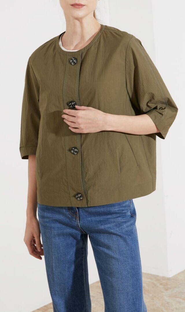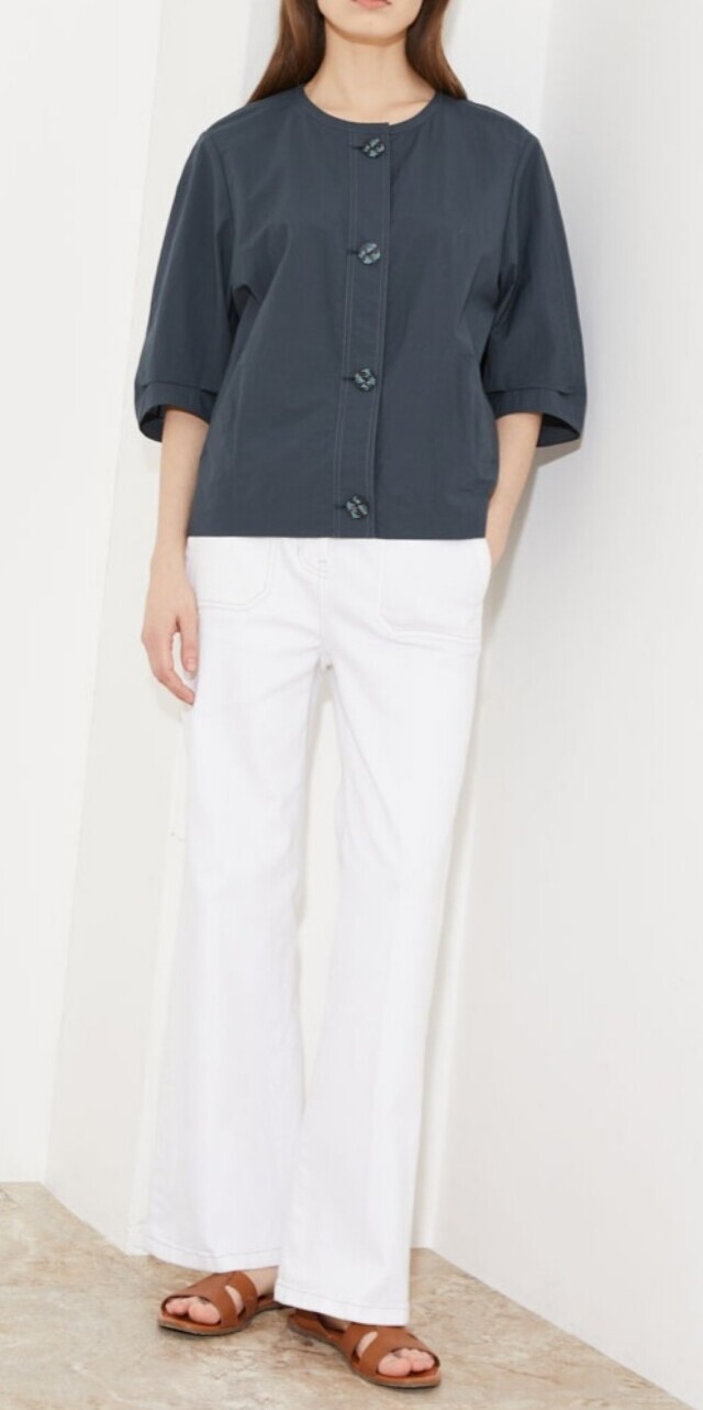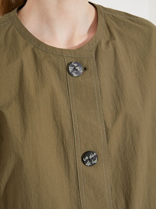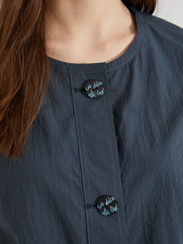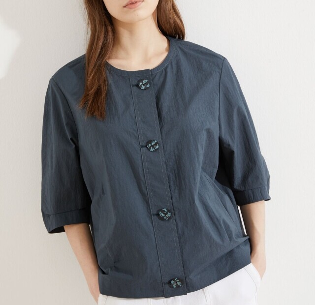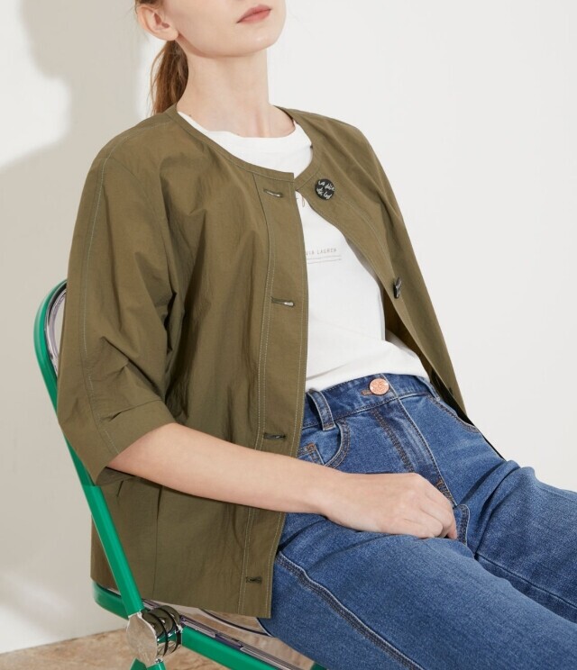 배삭 스티치로 포인트를 주었으며 앞 단추가 캐주얼