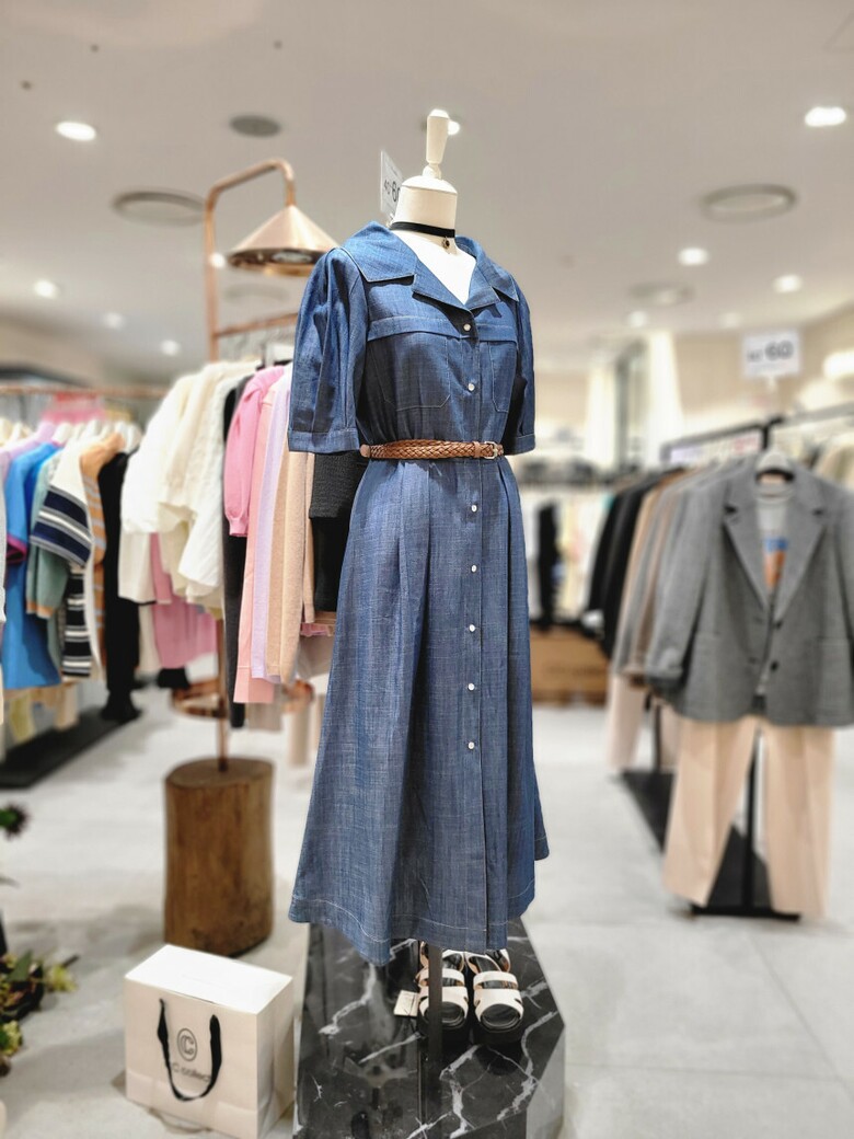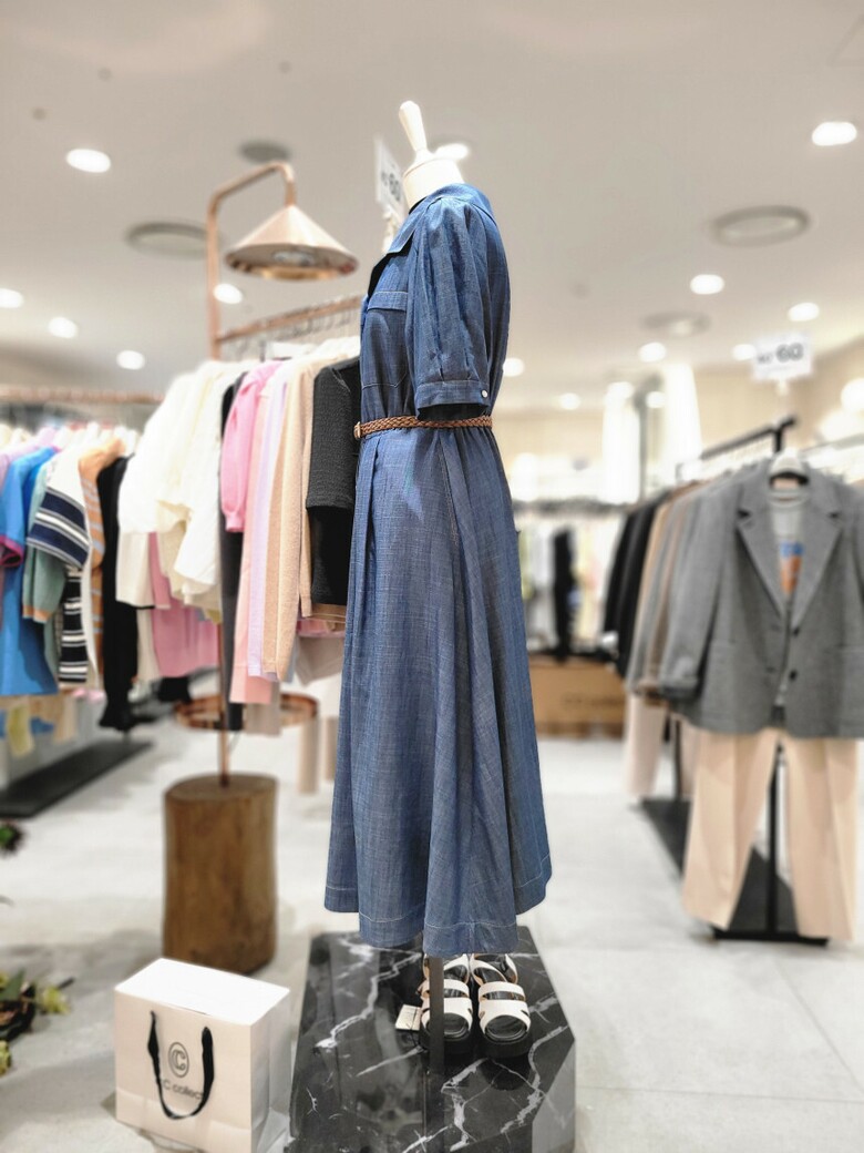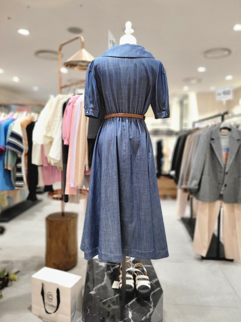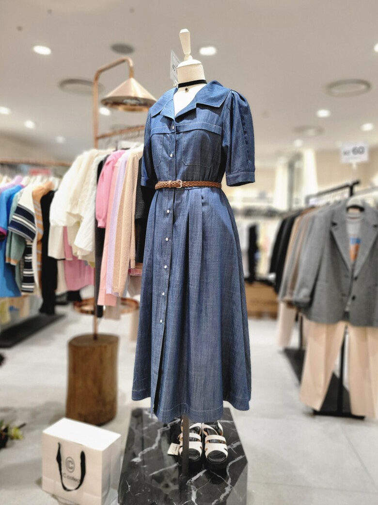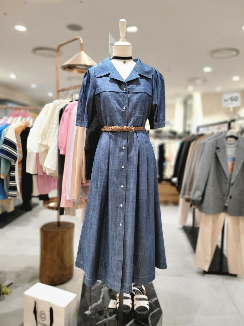 씨씨콜렉트 오픈 카라넥 벨티드 데님 롱 원피스 E242MSE135