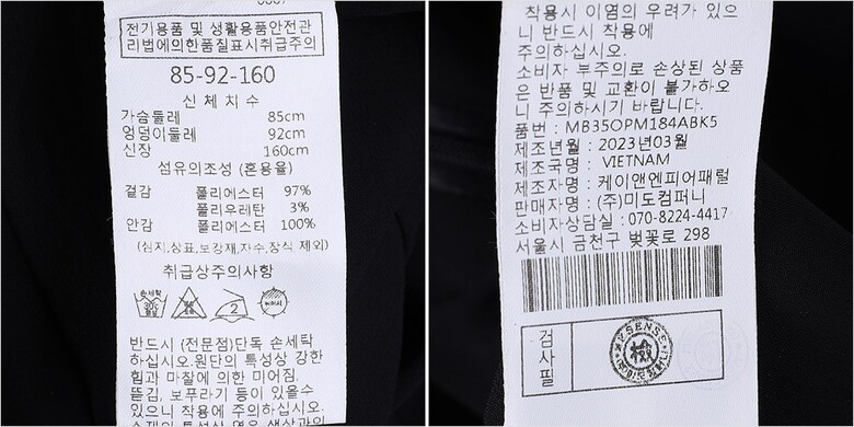| 1. 제품 소재 (섬유의 조성 또는 혼용률을 백분율로 표시, 기능성인 경우 성적서 또는 허가서) | 겉감:폴리에스터97% 폴리우레탄3% 안감:폴리에스터100% |