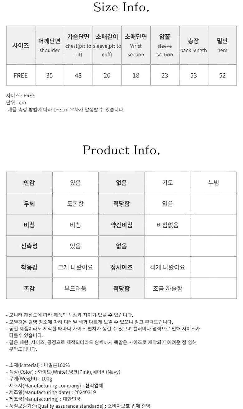 어깨단면 / 가슴단면 / 소매길이 / 소매단면 / 암홀 / 총장 / 밑단 (FREE)35 / 48 / 20 / 18 / 23 / 53 / 52