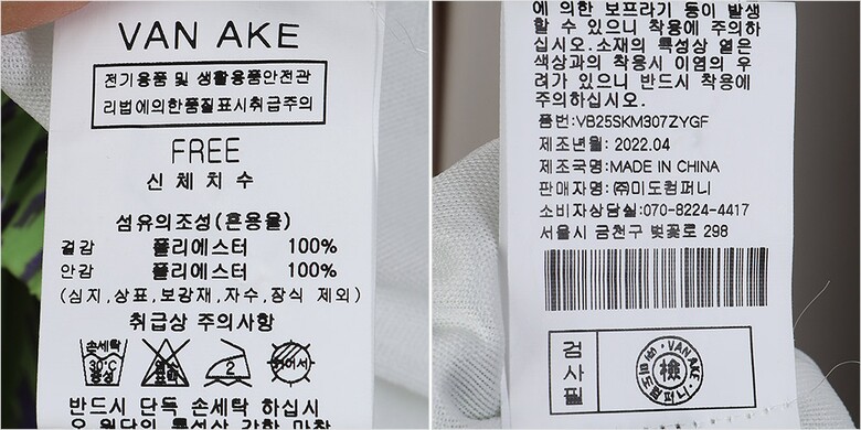 | 1. 제품 소재 (섬유의 조성 또는 혼용률을 백분율로 표시, 기능성인 경우 성적서 또는 허가서) | 겉감:폴리에스터100% 안감:폴리에스터100% |