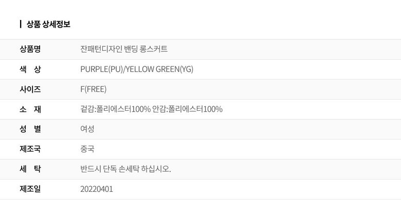 | 6. 세탁방법 및 취급시 주의사항 | 상세페이지 참조 |