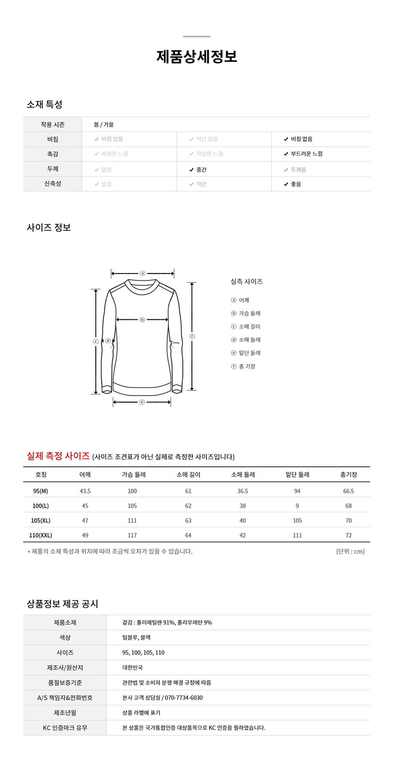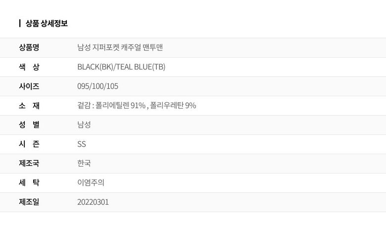| 1. 제품 소재 (섬유의 조성 또는 혼용률을 백분율로 표시, 기능성인 경우 성적서 또는 허가서) | 겉감 : 폴리에틸렌 91% , 폴리우레탄 9% |