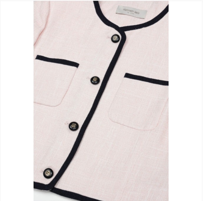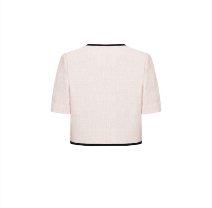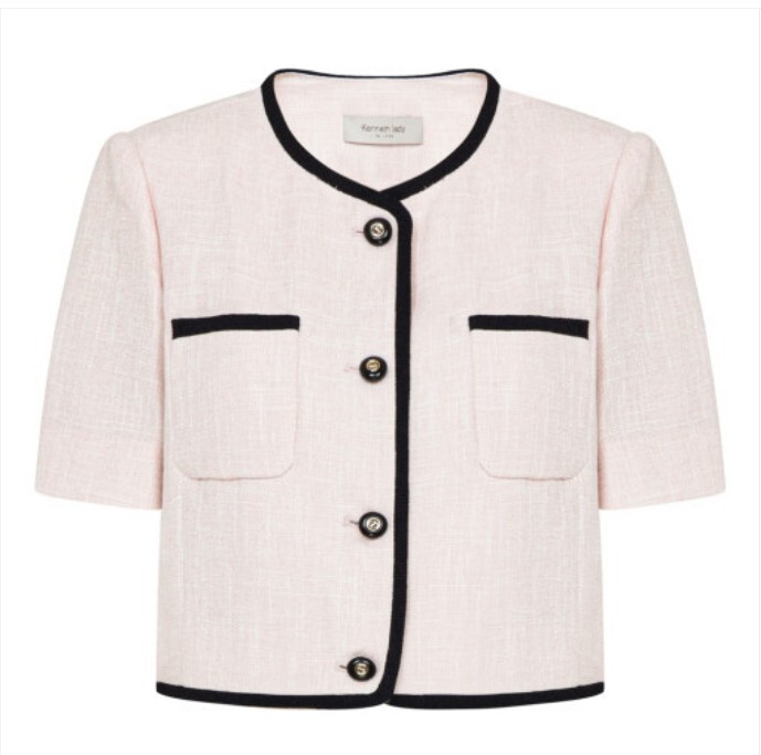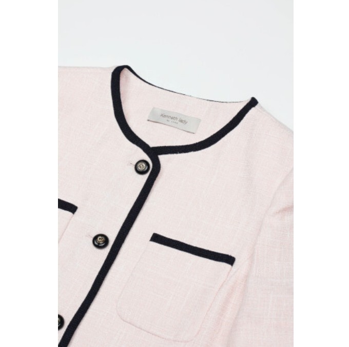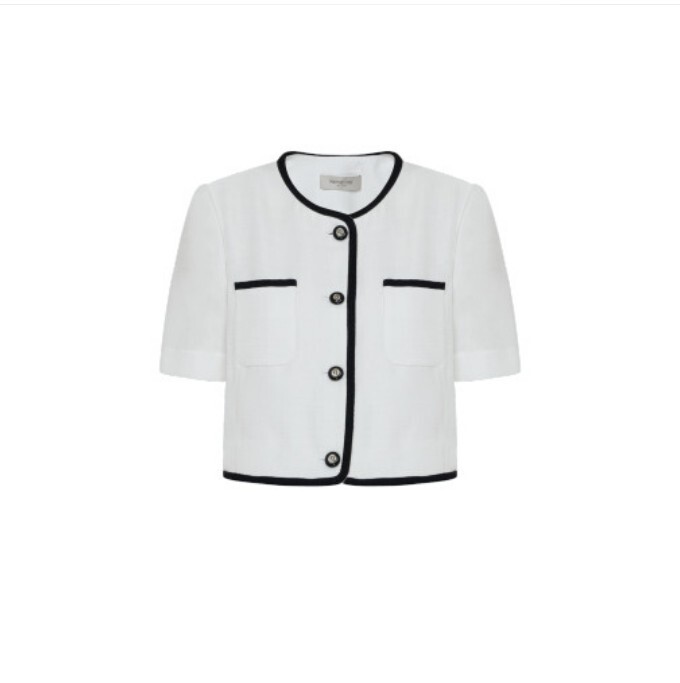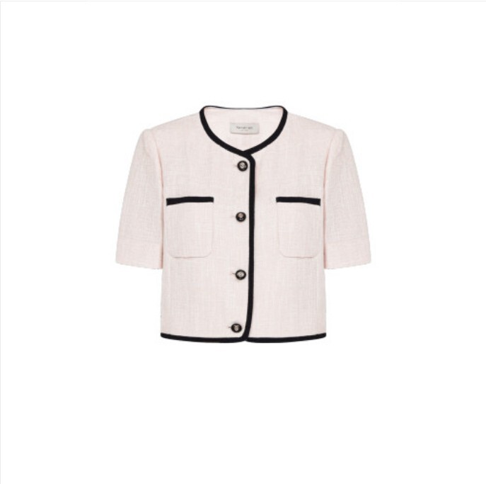 라인배색 디테일이 매력적인 라운드넥 디자인의 반소매 트위드 자켓입니다.