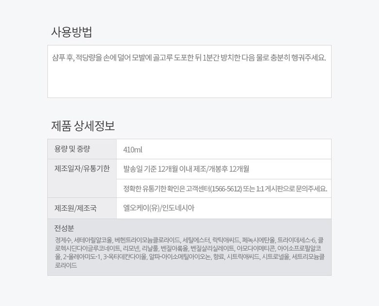 | 4. 사용방법 | 샴푸 후, 적당량을 손에 덜어 모발에 골고루 도포한 뒤 1분간 방치한 다음 물로 충분히 헹궈주세요. |