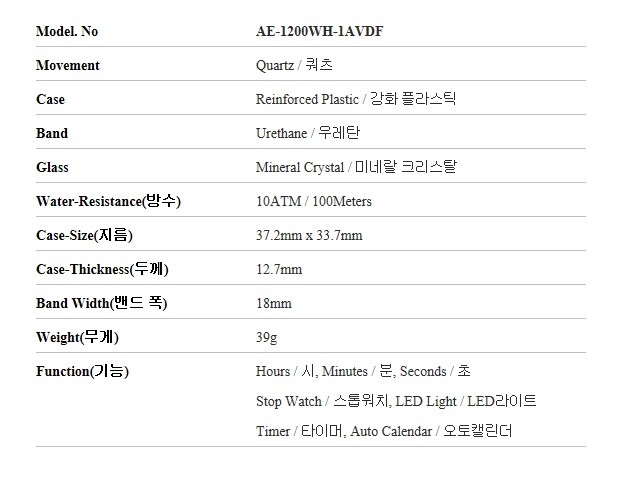 카시오 시계 AE-1200WH-1AVDF (AE-1200WH-1A) 디지털 스포츠 남성우레탄시계 당일발송