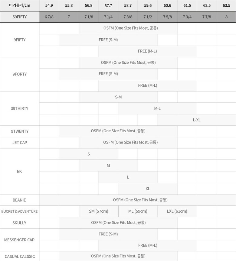 59FIFTY란 MLB 선수용 모자로 개발된 New Era의 시그니처 모델이자 최초의 Fitted Cap입니다. 사용자의 두상 크기에 따라 각 0.9cm의 편차를 두고 성인 9개, 유아용 8개 총 17개의 사이즈로 구성되어 착용 시 최고의 Fitting감을 줄 수 있도록 고안되었습니다. 각 Size는 59FIFTY를 상징하는 Gold Visor Sticker에 표기되어 모자 챙 상단에 부착되어 있으며, 모자의 챙은 기본적으로 Flat visor로 제작됩니다. 이는 제품의 이동 시 파손을 방지함과 동시에 개인의 취향에 따라 다양한 각도로 구부려 착용할 수 있도록 하기 위함이며, 선수의 경기력 향상과 부상 방지를 위하여 가벼운 펄프 소재의 심지로 구성되어 있습니다.
