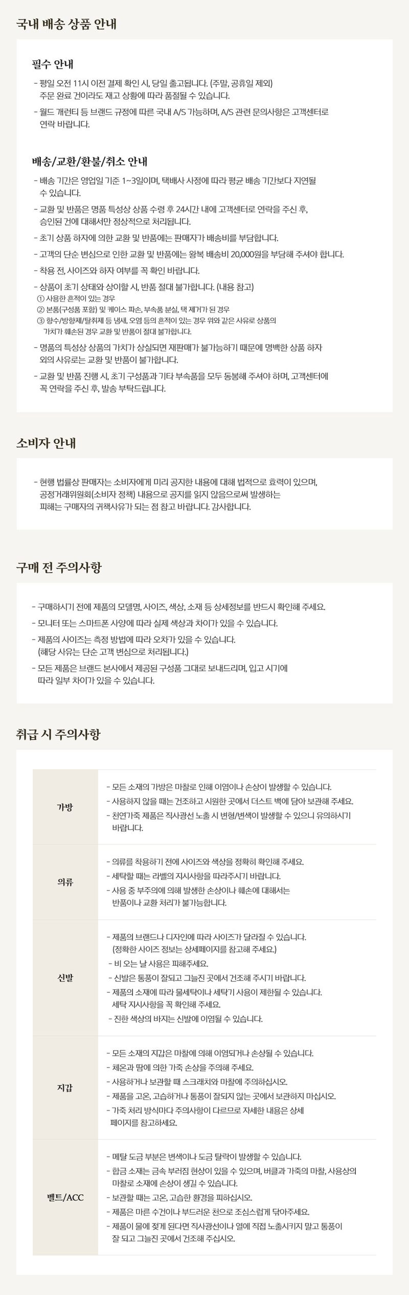 • 아울렛 상품 특성상 사이즈 등의 교환은 불가능하며, 반품 후 재주문 하셔야 합니다.