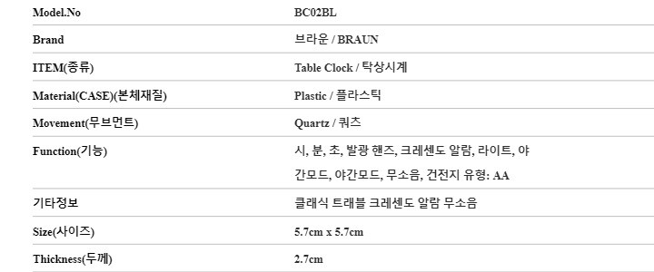 | 7. 주요 사양 | 플라스틱 탁상시계 쿼츠 |