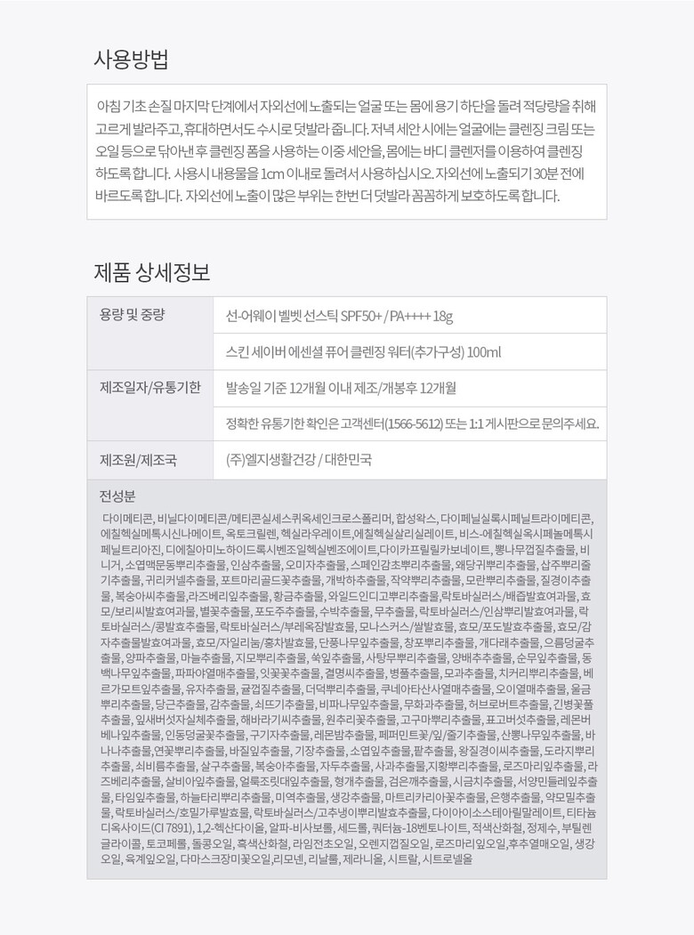 | 4. 사용방법 | 아침 기초 손질 마지막 단계에서 자외선에 노출되는 얼굴 또는 몸에 용기 하단을 돌려 적당량을 취해 고르게 발라주고, 휴대하면서도 수시로 덧발라 줍니다. |