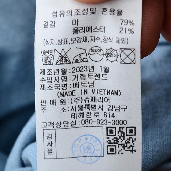 | 1. 제품 소재 (섬유의 조성 또는 혼용률을 백분율로 표시, 기능성인 경우 성적서 또는 허가서) | 마79%폴리에스터21% |