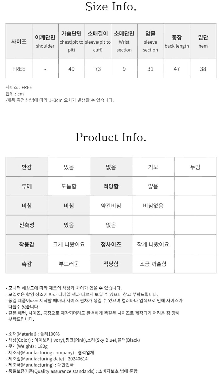 - COLOR(색상) : 아이보리(Ivory),핑크(Pink),소라(Sky Blue),블랙(Black)