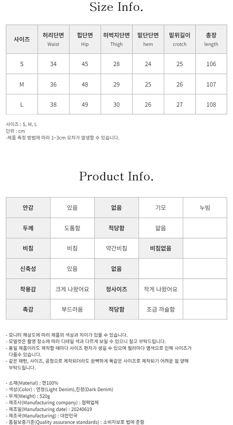 - COLOR(색상) : 연청(Light Denim),진청(Dark Denim)