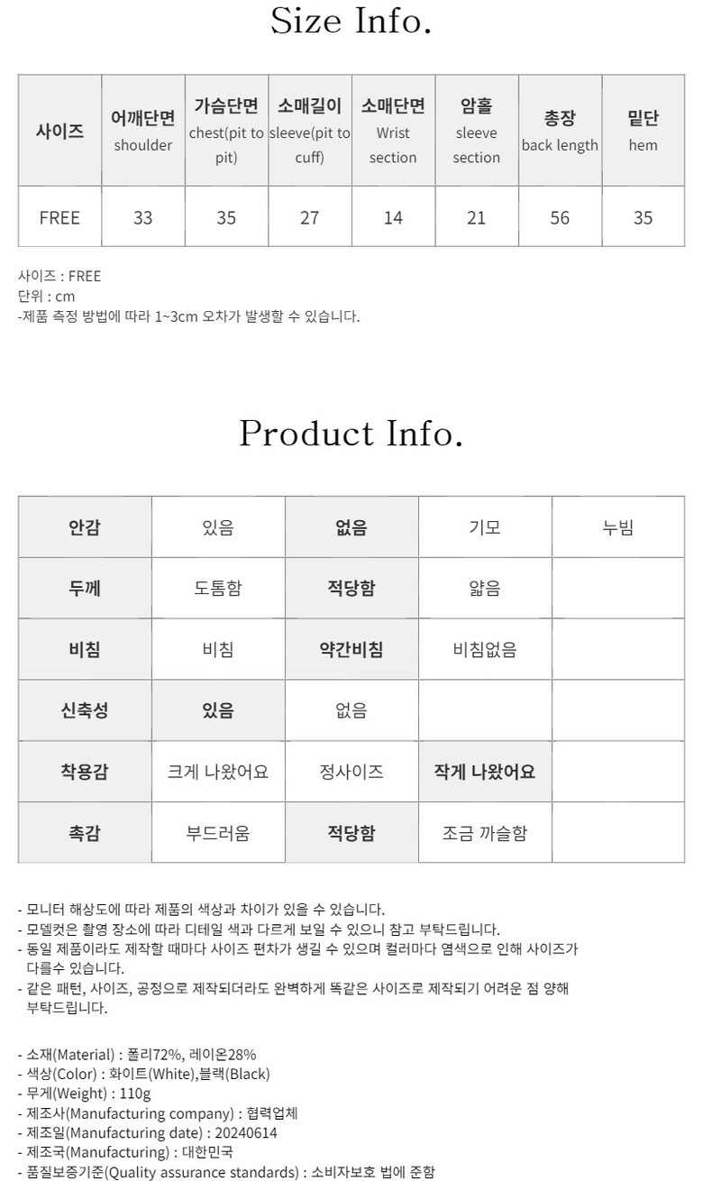 어깨단면 / 가슴단면 / 소매길이 / 소매단면 / 암홀 / 총장 / 밑단 (FREE)33 / 35 / 27 / 14 / 21 / 56 / 35