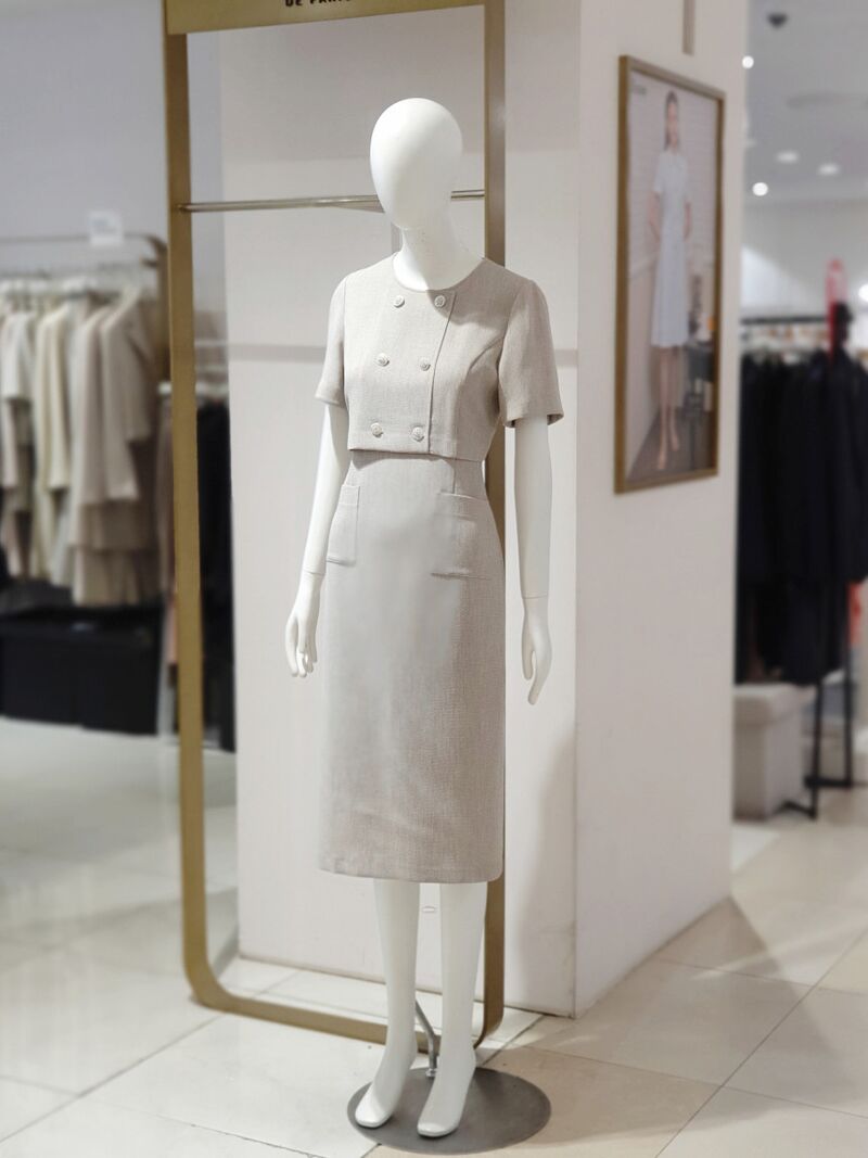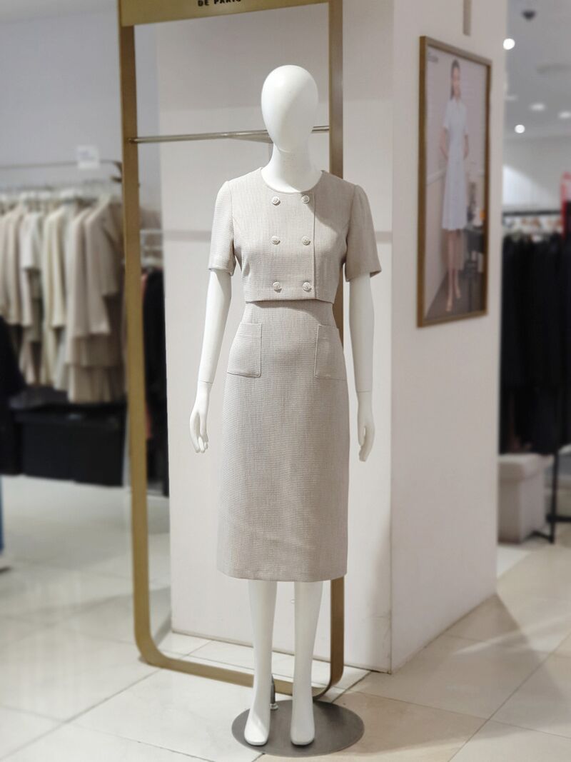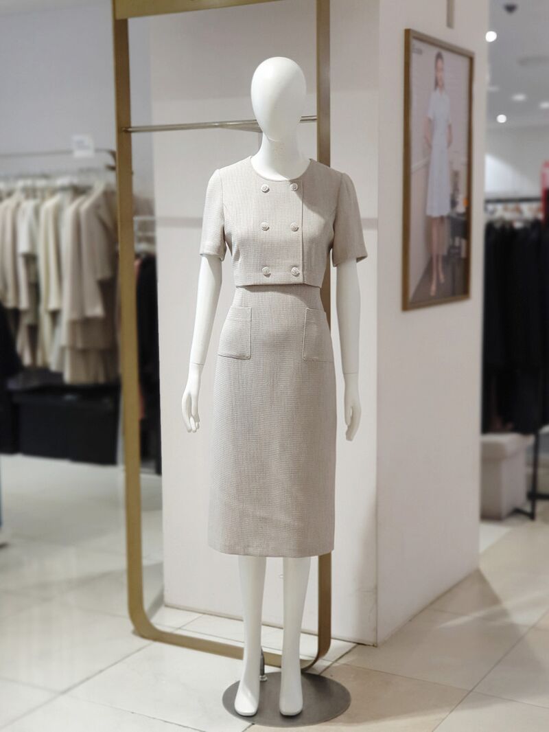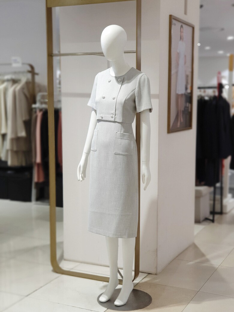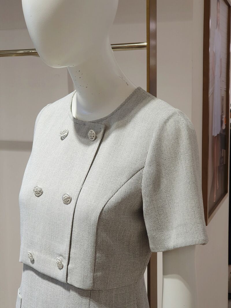 크롭 재킷 디자인의 상의에 더블 버튼 장식으로 포인트를 주며