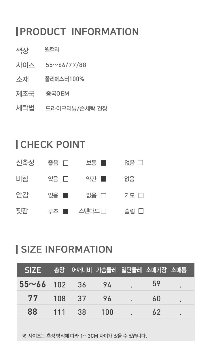 | 1. 제품 소재 (섬유의 조성 또는 혼용률을 백분율로 표시, 기능성인 경우 성적서 또는 허가서) | 상세페이지참고 |