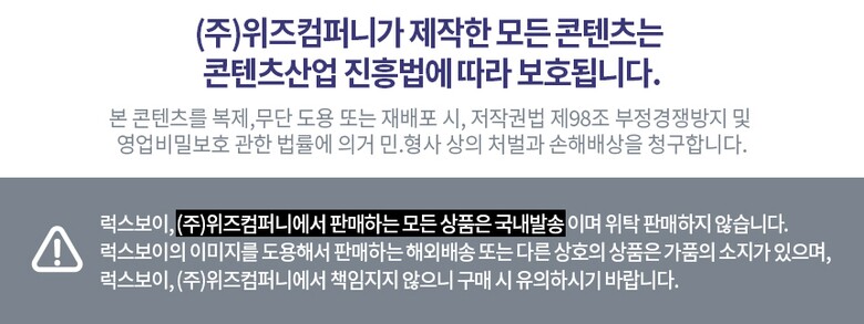 상품불량에 의한 반품, A/S, 품질보증 및 피해보상 등에 관한 사항은 소비자 분쟁해결기준(공정거래위원회 고시) 구매자가 미성년자인 경우에는 상품 구입시 법정대리인이 동의하지 아니하면 미성년자 본인 또는 법정대리인이 구매취소 할 수 있습니다. |