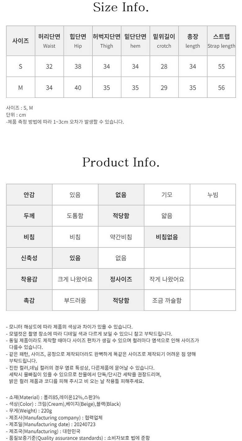 허리단면 / 힙단면 / 허벅지단면 / 밑단단면 / 밑위길이 / 총장 / 스트랩 (FREE)32 / 38 / 34 / 34 / 28 / 34 / 55