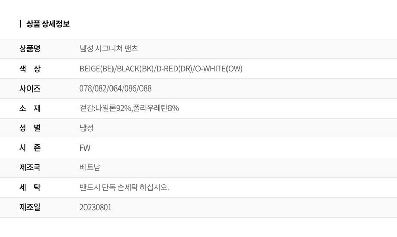 | 1. 제품 소재 (섬유의 조성 또는 혼용률을 백분율로 표시, 기능성인 경우 성적서 또는 허가서) | 겉감:나일론92%,폴리우레탄8% |