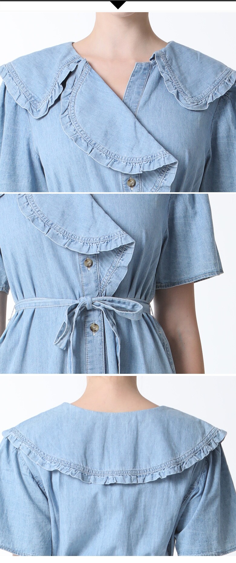 프릴 칼라로 포인트를 준 언밸런스한 벨티드 플레어 데님 원피스입니다. 브랜드만의 고급원단으로 가볍고 편안한 착용감을 선사합니다. 벨트로 실루엣 조절이 가능하며 여성스럽고 캐주얼한 디자인으로 데일리룩, 데이트룩 등으로 활용하기 좋습니다.