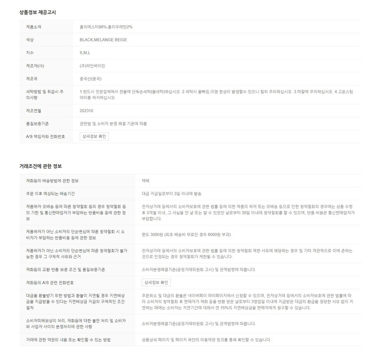 | 6. 세탁방법 및 취급시 주의사항 | 상품상세참조 |