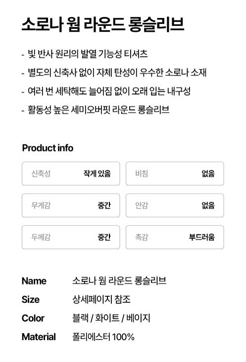 | 1. 제품 소재 (섬유의 조성 또는 혼용률을 백분율로 표시, 기능성인 경우 성적서 또는 허가서) | 상품상세참조 |