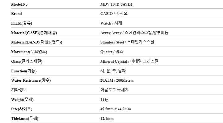 카시오 시계 MDV-107D-3AVDF (MDV-107D-3A) 아날로그 녹새치 남성메탈시계 당일발송