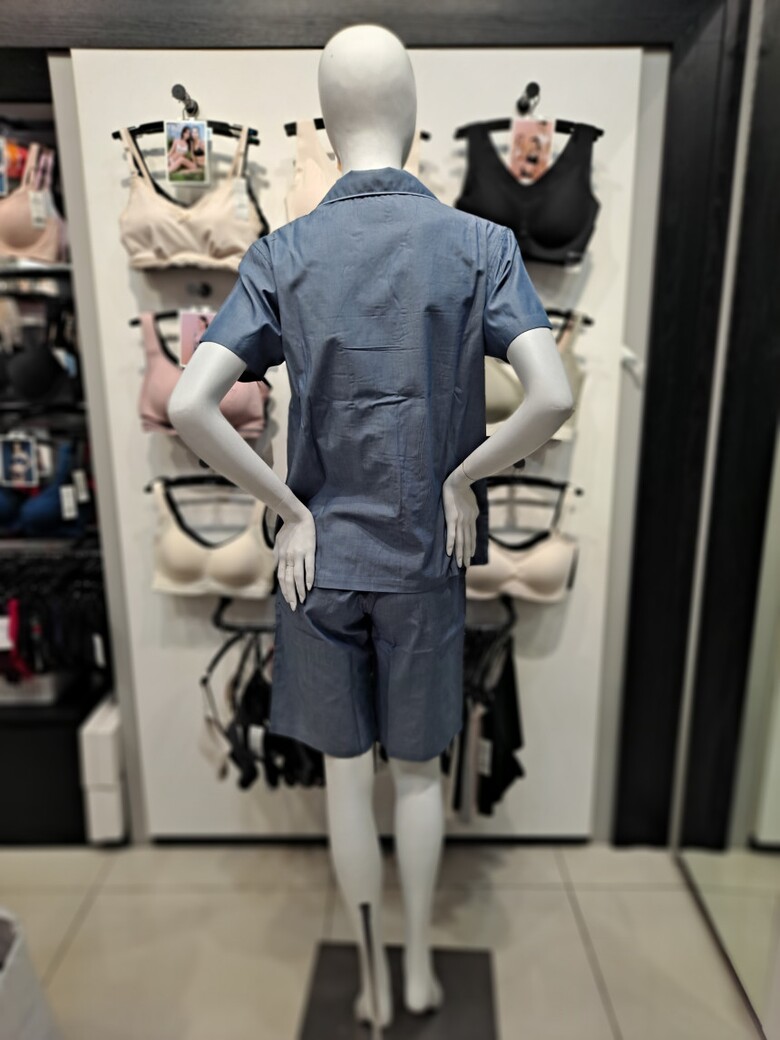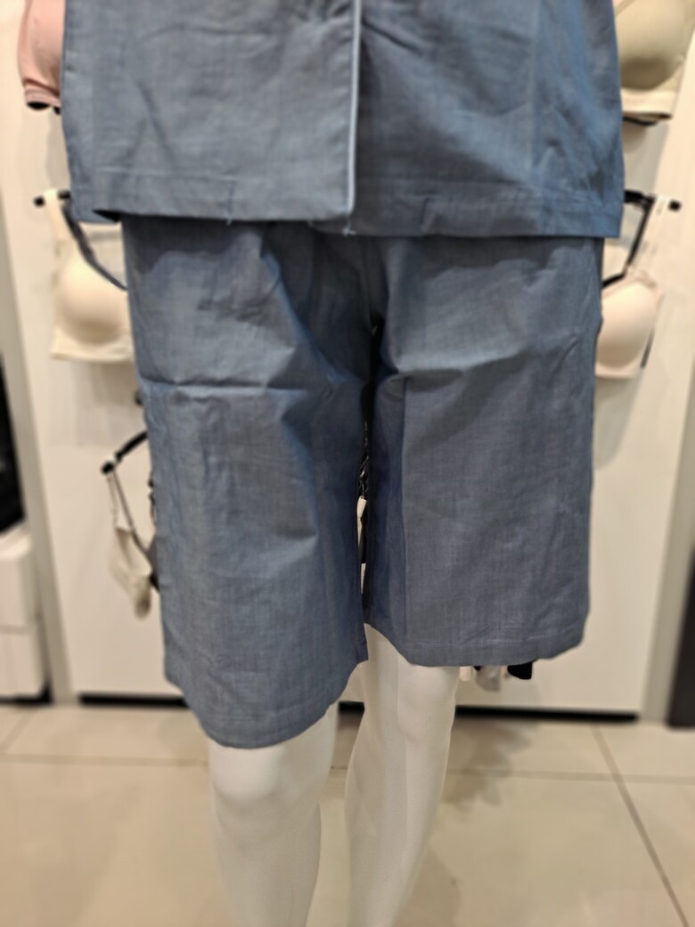 통이 넓은 반팔 소매와 5부 하의로 구성된 면 파자마 세트입니다