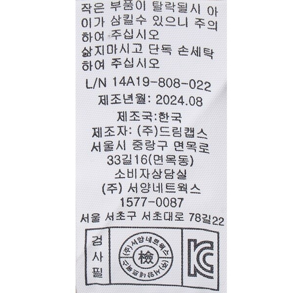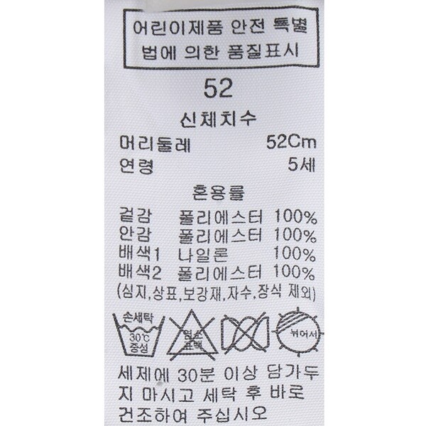 | 10. 취급방법 및 취급시 주의사항, 안전표시 (주의, 경고 등) | 세제에 30분 이상 담가두지 마시고 세탁 후 바로 건조하여 주십시오. 비틀어 짜지 마시오 작은 부품이 탈락될시 아이가 삼킬수 있으니 주의하여 주십시오 삶지마시고 단독 손세탁하여 주십시오 |