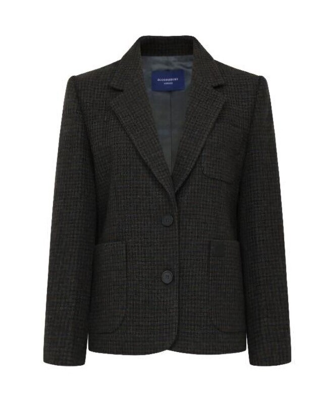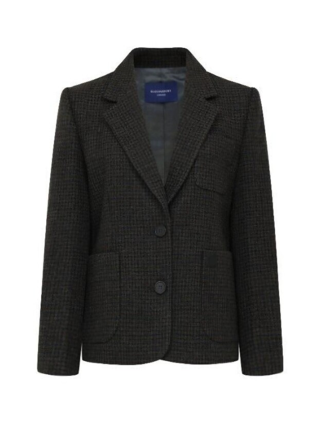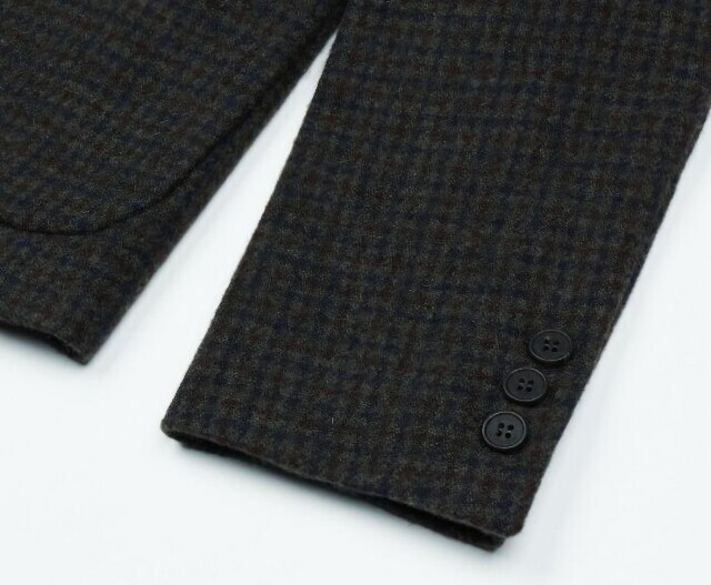 톤다운된 깊은 색상의 잔 체크가 클래식한 느낌의 쟈겟입니다. 기본 디자인으로 유행없이 두루두루 입기좋아요.
