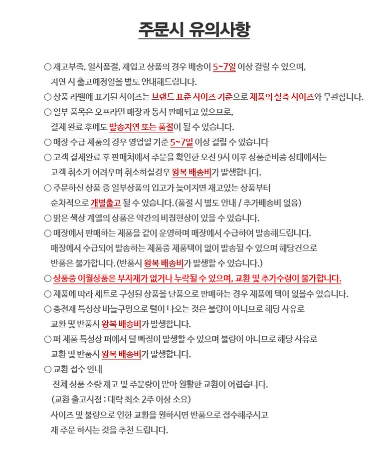 • 모든 규정은 전자상거래법에 의거하며, 택배사정으로 배송이 지연된 경우 재화를 공급받은 날로부터 7일 이내에 반품 가능합니다.