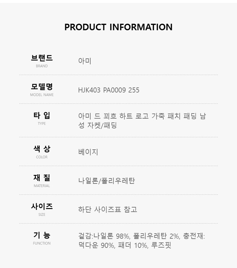 아미 HJK403 PA0009 255 아미 드 꾀흐 하트 로고 가죽 패치 다운 남성 패딩 점퍼
