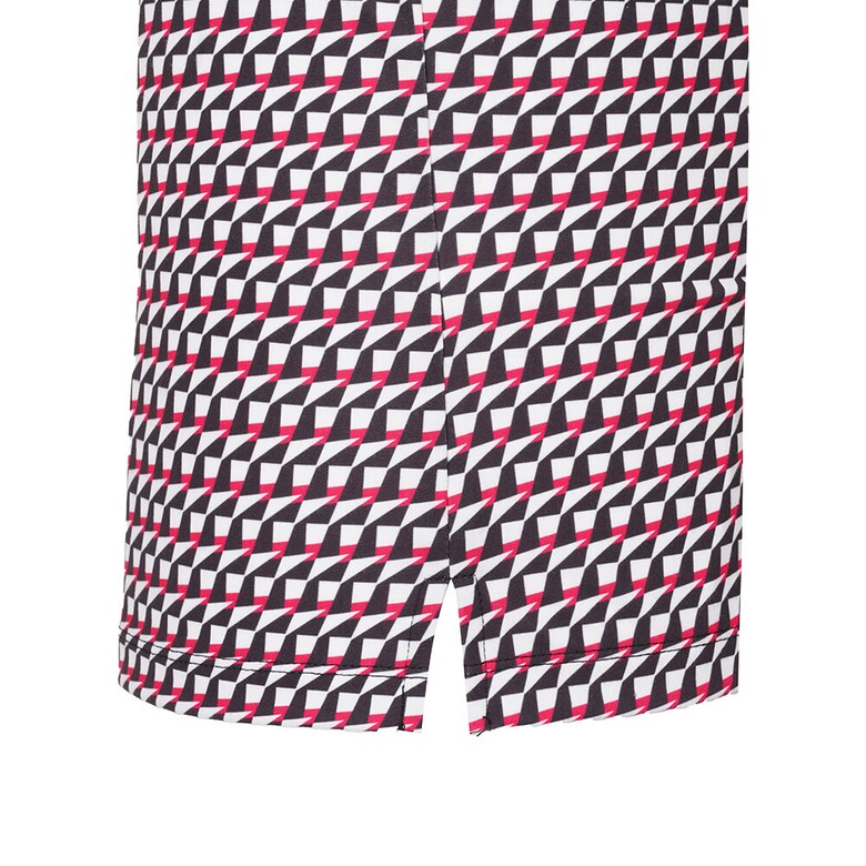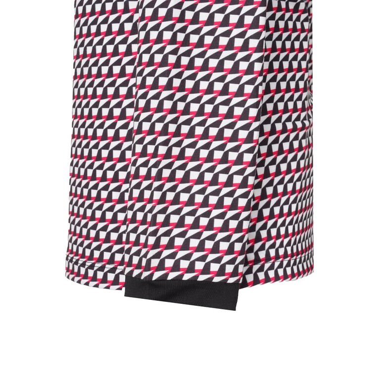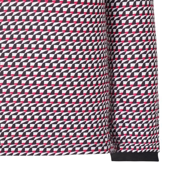 코트나 소재를 사용하여 터치감이 부드럽고 전판 기하학 프린트와 카라+소매단 솔리드 배색이 세련미를 더해주는 것이 포인트인 집업 카라 티셔츠