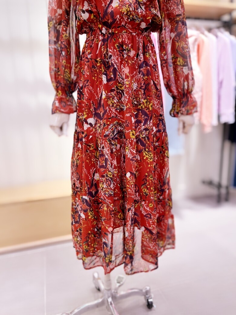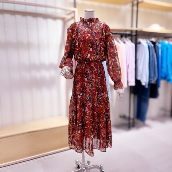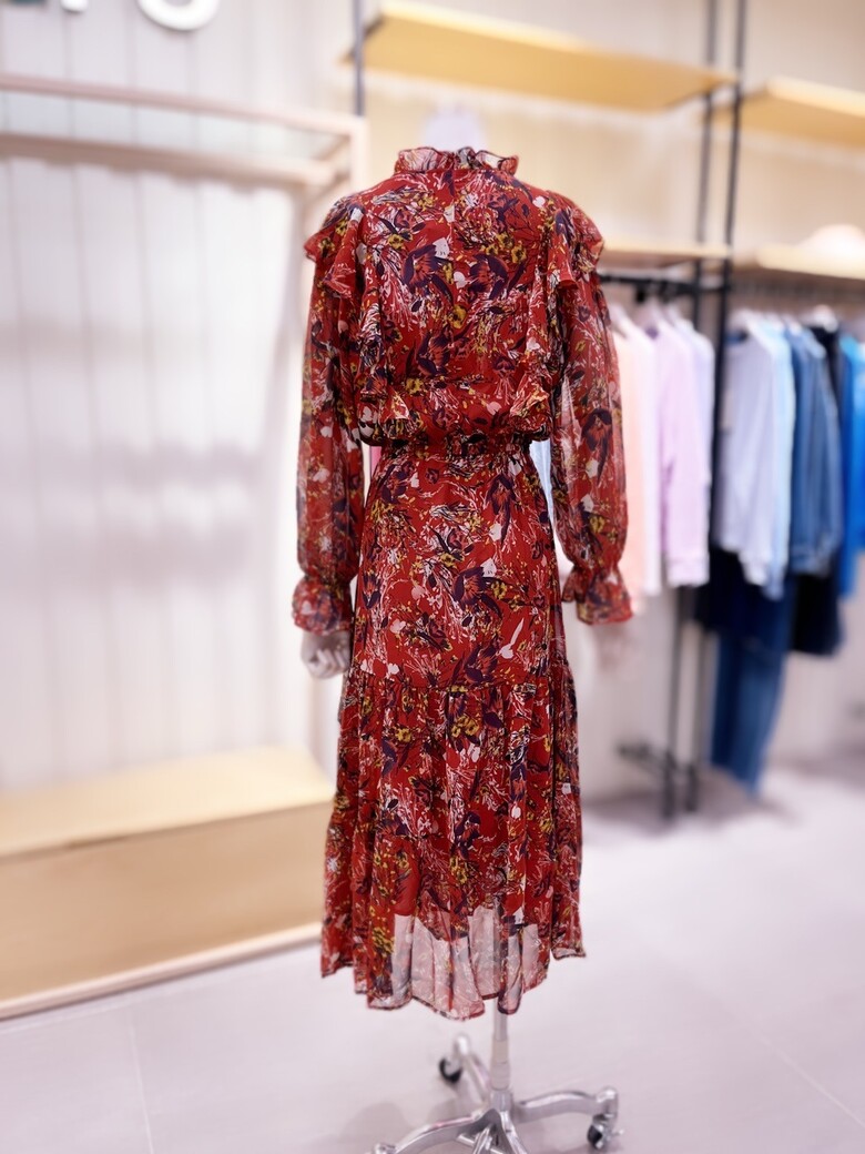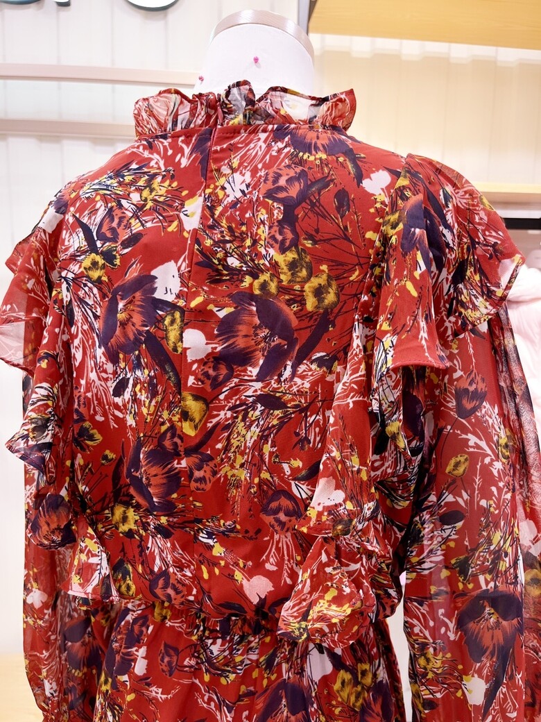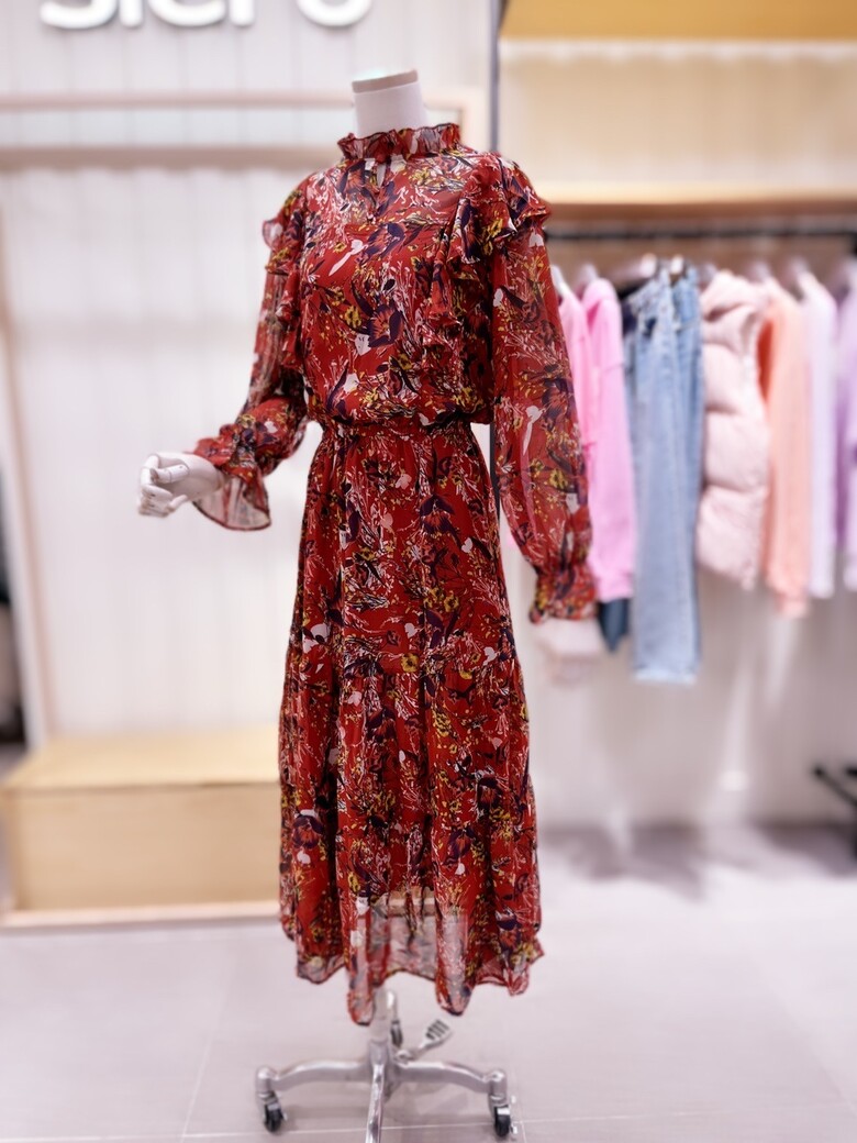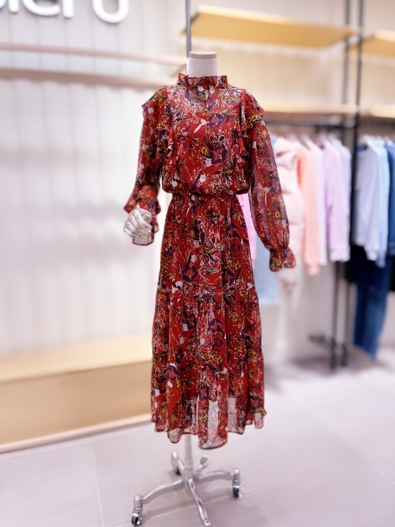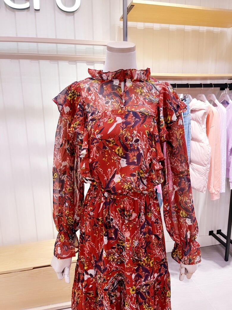 플라워 프린트 러플 원피스?플라워 프린트 패턴이 여성스러운 무드를 더하며?롱한 기장감으로 부담 없이?데일리로 착용하기 좋은 롱 원피스 입니다